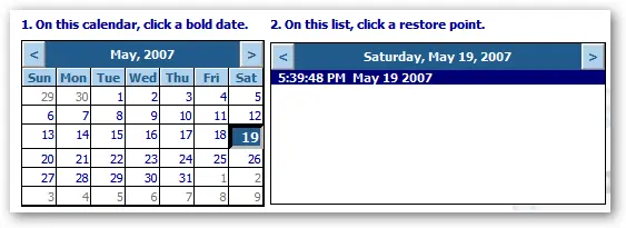 Click the next button, and you’ll be shown a calendar with bold dates wherever there is a restore point. Click on the date, and then click a restore point in the right hand side.